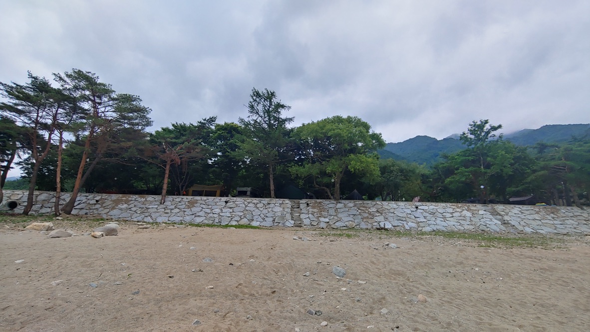점심을 먹은 후 개울에 나왔습니다. 개울에서 바라 본 캠핑장. 송림으로 되어 있어 타프없이도 캠핑이가능합니다.