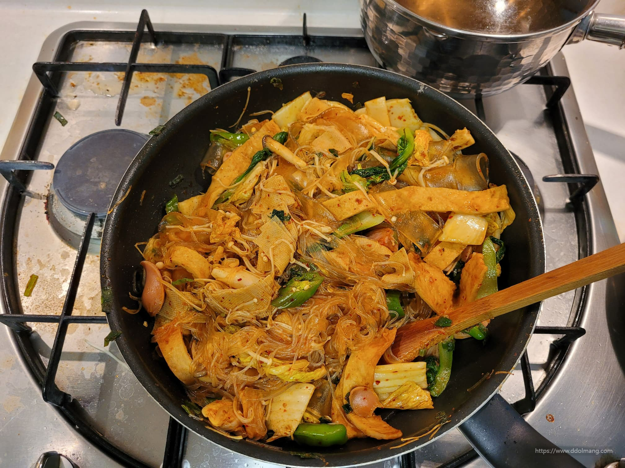 대부분 재료는 이미 익어 있으므로 살짝만 볶아준 뒤, 훠궈 소스(마라샹궈 소스)를 넣고 전체가 고르게 버무려질 때까지 볶아줍니다.