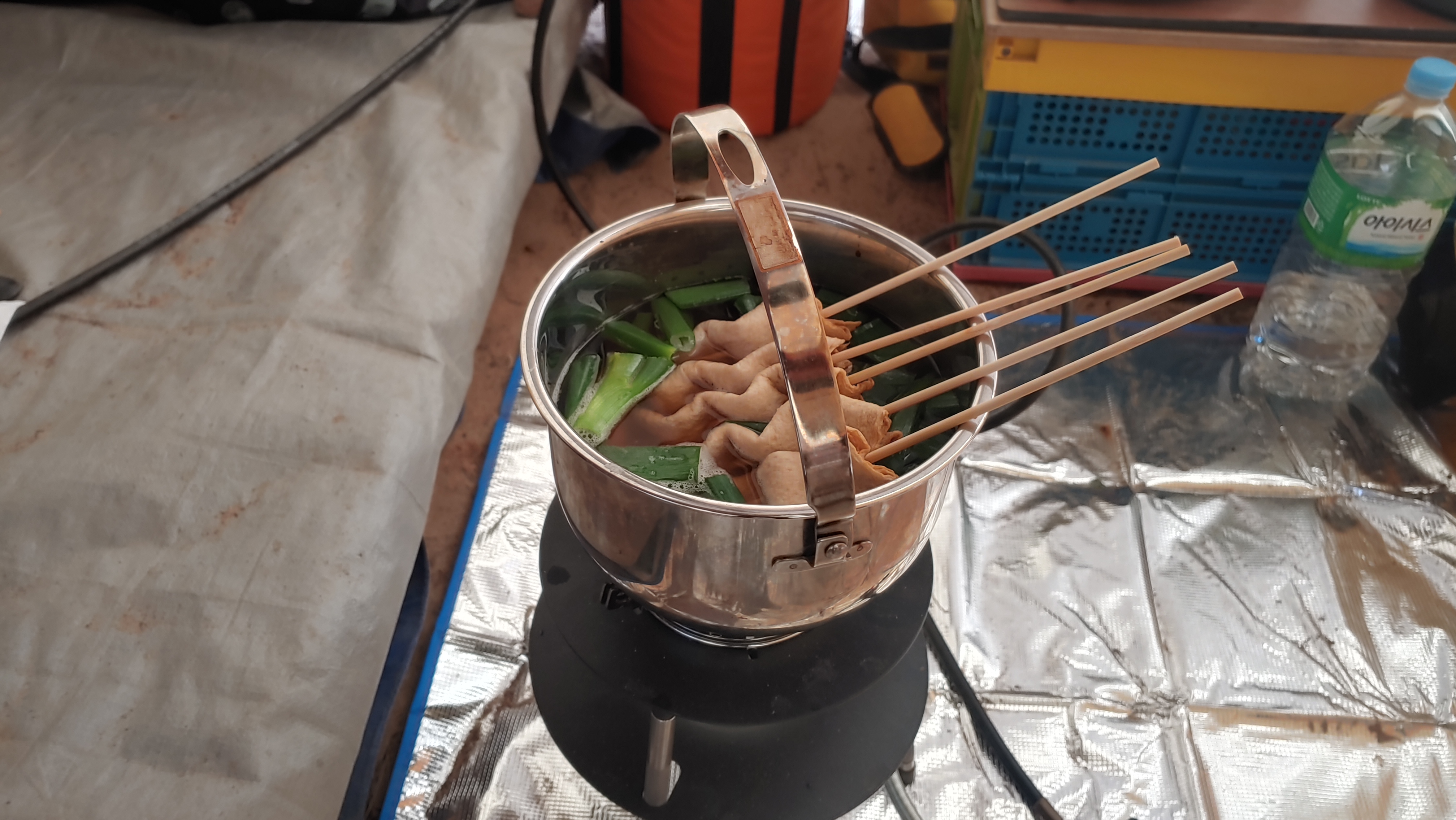 오뎅탕도 캠핑요리의 별미입니다. 꼬치를 꼽고 남은 파를 이용해서 시원하게 끓여보세요.
