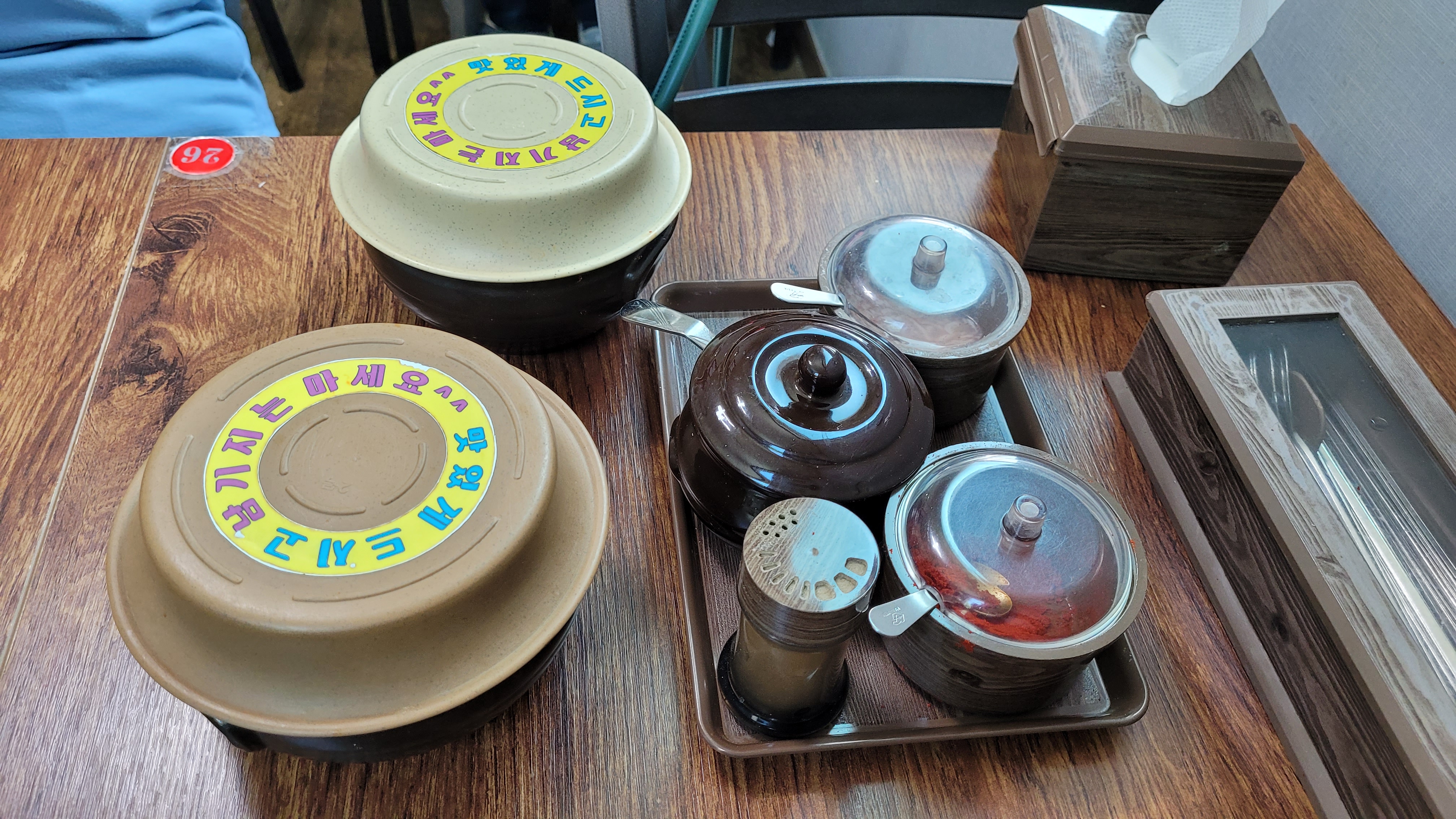 김치와 깍두기가 담긴 통이 테이블에 있으며 순대국에 넣을 새우젓, 들깨가루, 고운고추가루, 후추가루가 구비되어 있습니다.