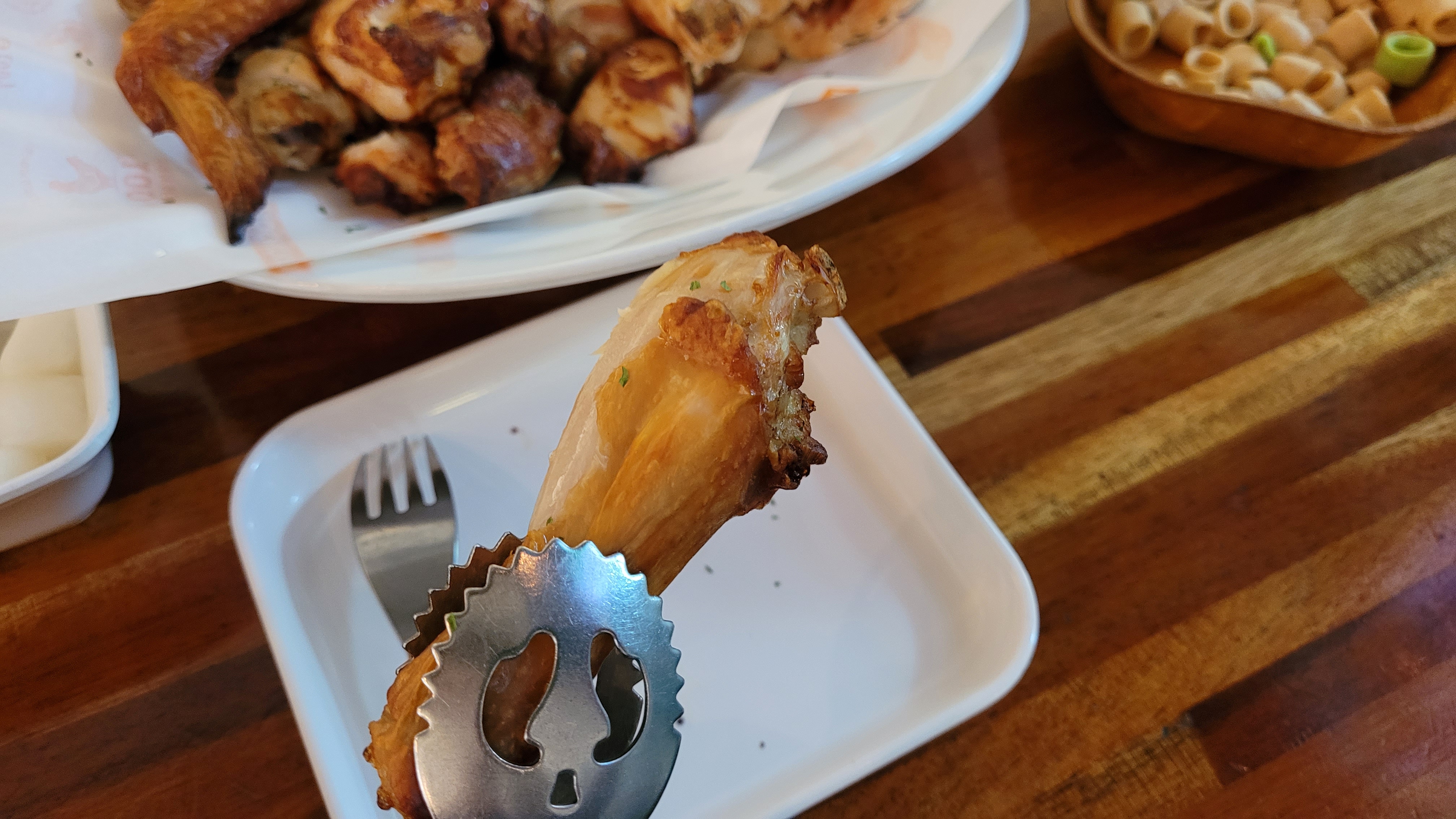 제공한 집게로 먹는 닭다리. 나중에는 그냥 손으로 먹었습니다. 담백하니 맛있습니다.