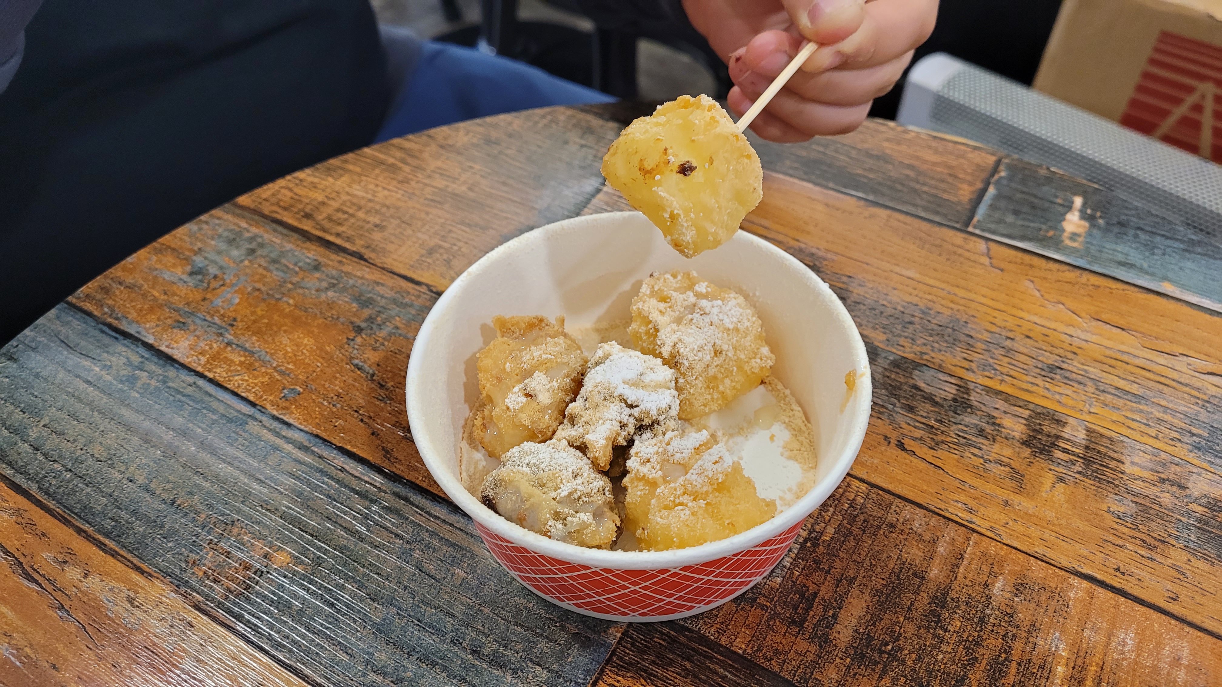 우유덩어리 같은걸 튀기는데 고소한 맛과 달콤한 맛이 납니다.