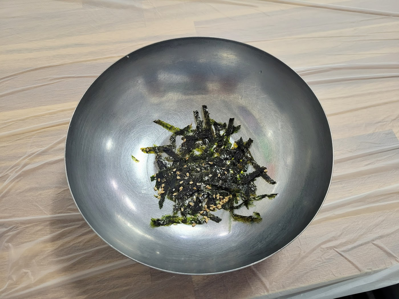 음식이 나올 때, 그릇에 김가루가 따로 담겨 나옵니다. 저희는 이게 어디에 쓰는 건가 어리둥절했는데, 사장님께서 친절하게 알려주시더군요. 바로 이 멸치회무침에 김가루를 듬뿍 넣고 비벼 먹는 것이었습니다! 짭조름한 김가루가 들어가니 감칠맛이 두 배가 되었습니다. 꼭 잊지 말고 비벼 드세요!