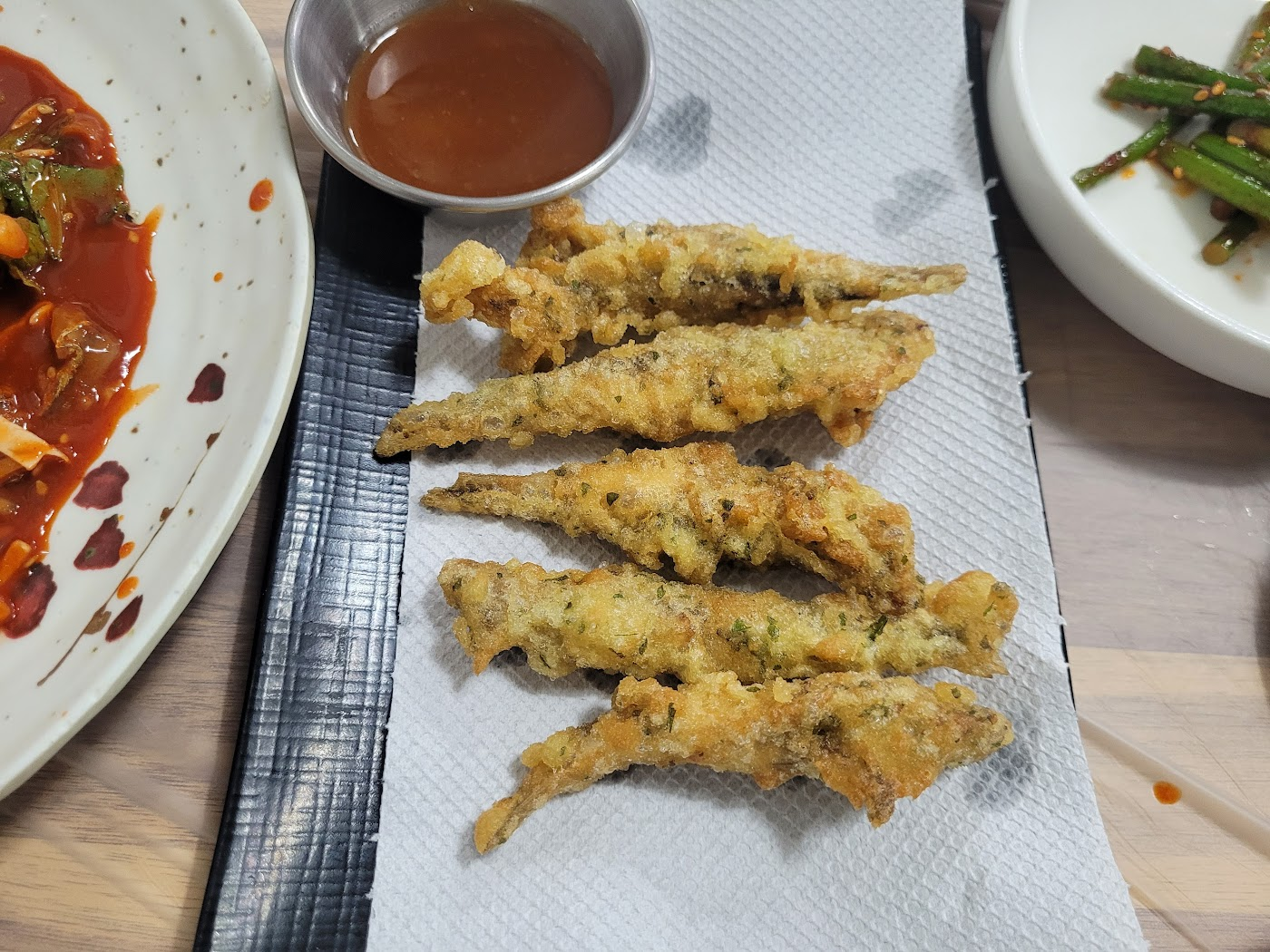 다음은 멸치튀김입니다. 멸치를 통째로 바삭하게 튀겨냈는데, 이건 뭐 맛이 없을 수 없는 조합이죠. 겉은 바삭하고 속은 멸치의 고소한 맛이 느껴졌습니다.