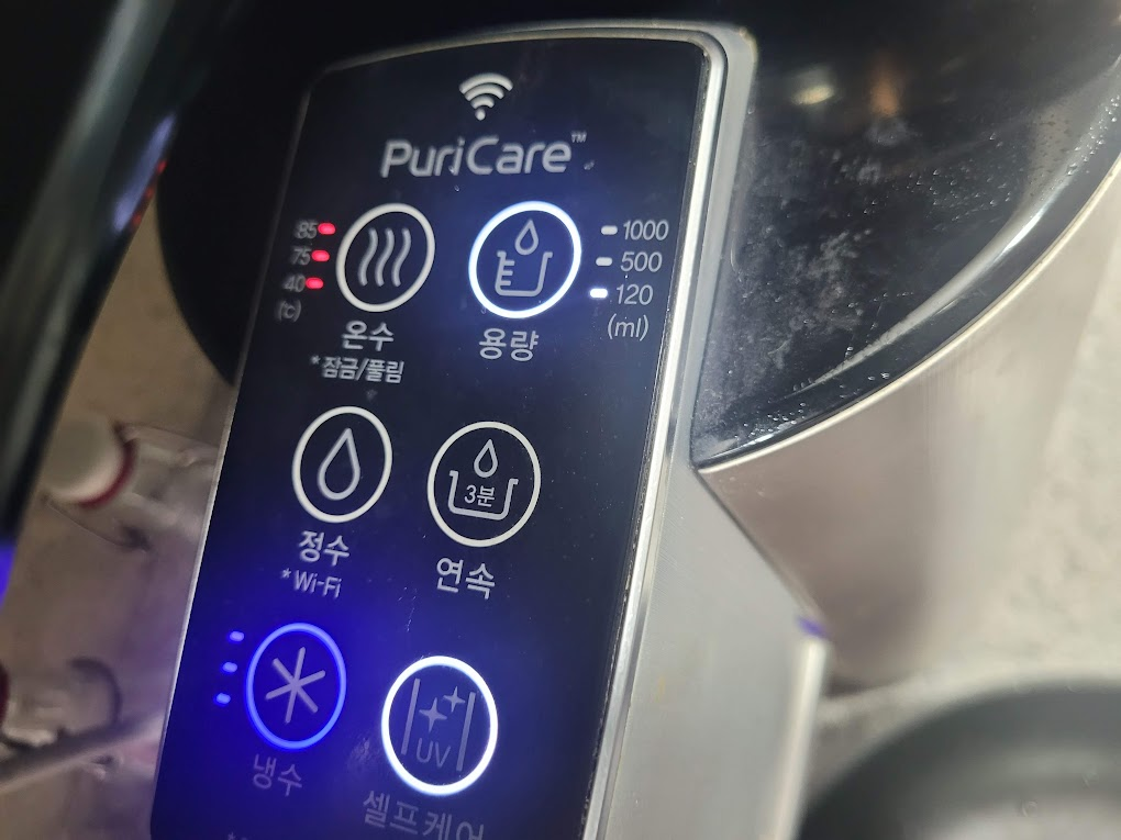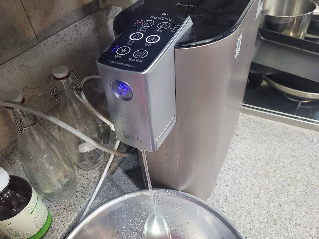 '연속' 버튼을 눌러 물을 최소 5분 이상 충분히 흘려보내 주세요. 처음에는 검은 물이나 기포가 섞인 물이 나올 수 있으나, 이는 자연스러운 현상이니 걱정 마세요. 맑은 물이 나올 때까지 충분히 빼주면 드디어 모든 과정이 끝납니다!