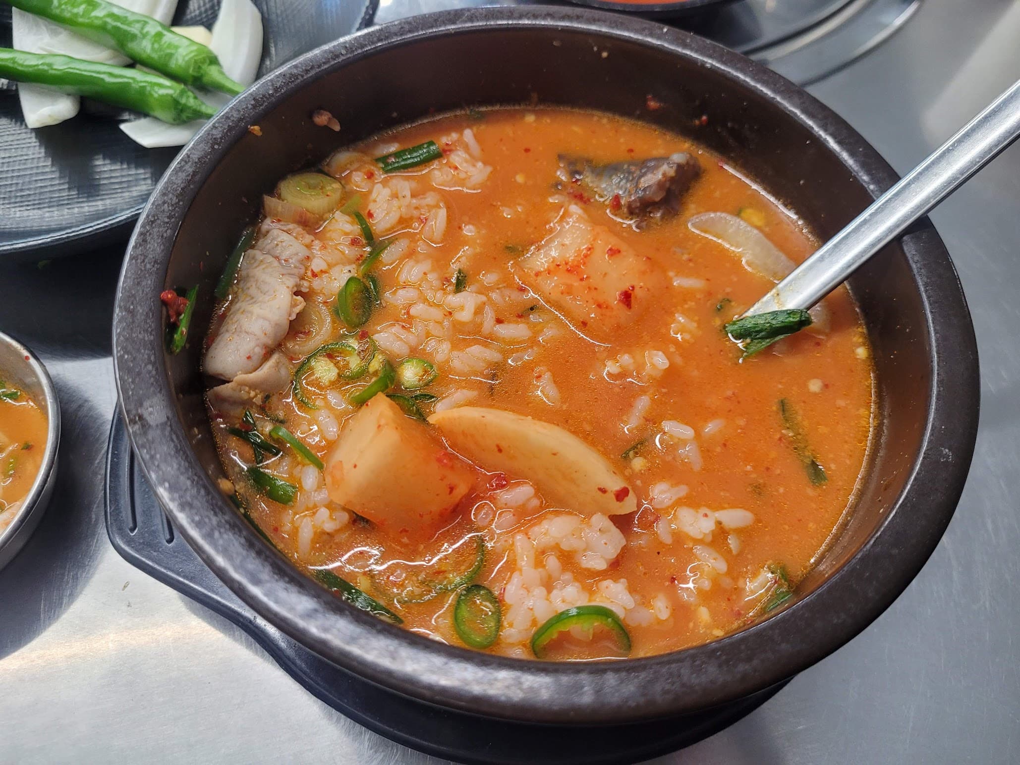 건더기를 어느 정도 다 건져 먹은 뒤에 밥을 말고, 여기에 청양고추와 깍두기, 그리고 깍두기 국물을 조금 넣어 잘 섞어 먹습니다. 이렇게 먹으면 그냥 처음부터 밥을 말아 먹는 것보다 조금 더 천천히, 요리처럼 즐길 수 있는 느낌이 들더라고요.