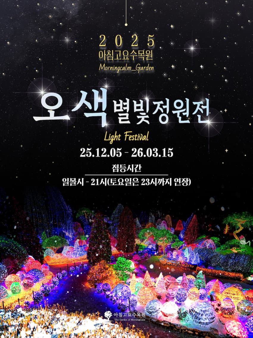 꽃과 나무 대신, 수백만 개의 LED 조명이 정원을 가득 채우는 곳. 겨울의 아침고요수목원은 이름 그대로 빛으로 가득 찬 정원이 됩니다. 서울 근교에서 드라이브 겸 겨울 산책을 즐기기 좋은 대표 코스예요.