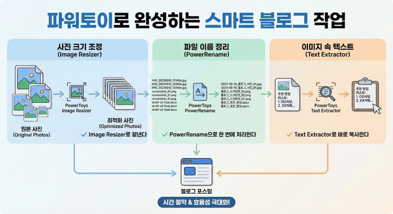블로그 사진 리사이즈부터 파일 이름 정리, 이미지 속 텍스트 추출까지 파워토이로 작업 흐름을 단순하게 만드는 실전 활용 방법을 정리했습니다.