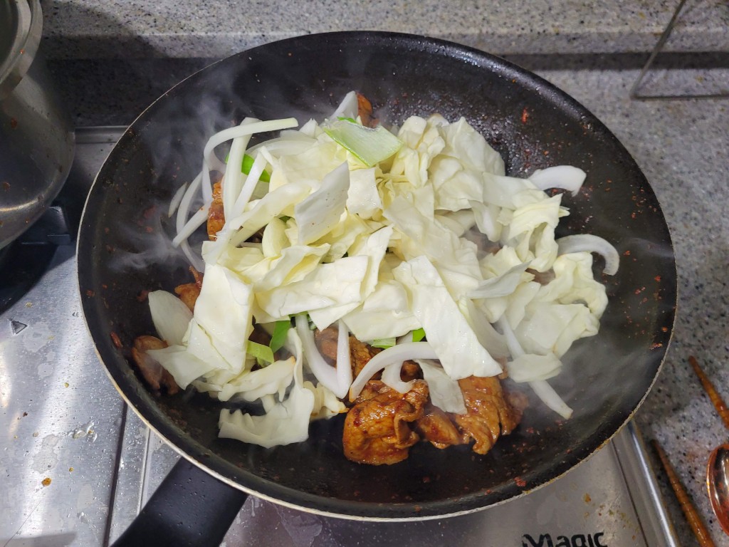 제육볶음은 오래 볶는 음식이 아니라 센 불에 빠르게 볶아 불맛을 살리는 것이 포인트입니다.