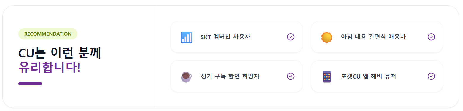 CU는 통신사 제휴 할인, 포켓CU 앱 기반 구독 서비스, 멤버십 포인트 적립, 제휴 카드 및 간편결제 혜택 등을 결합한 형태로 할인 구조를 운영하고 있습니다. 특히 구독 서비스가 품목별로 세분화되어 있어, 자주 구매하는 카테고리에 맞춰 선택 가입할 수 있도록 구성되어 있습니다.