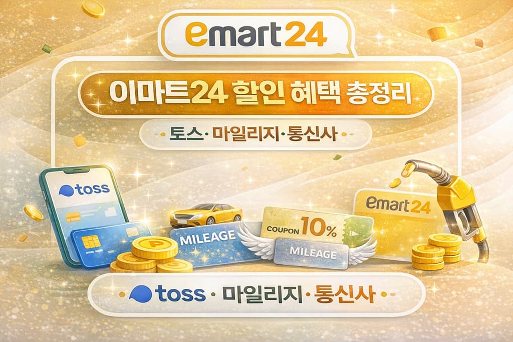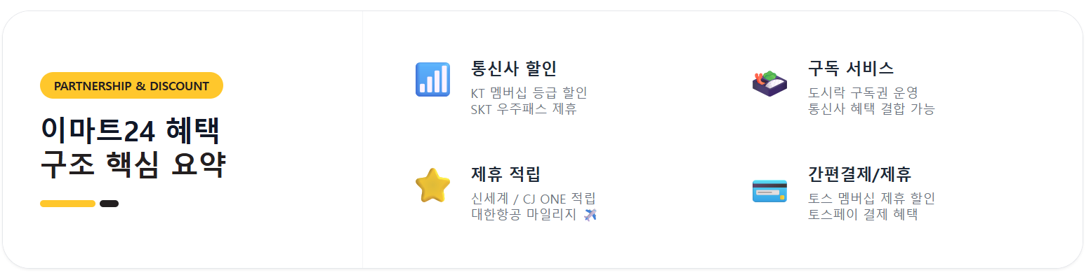 이마트24의 토스 멤버십 할인, 신세계포인트·CJ ONE·대한항공 마일리지 적립 구조, KT 멤버십 및 SKT 우주패스 제휴 혜택을 항목별로 정리했습니다.