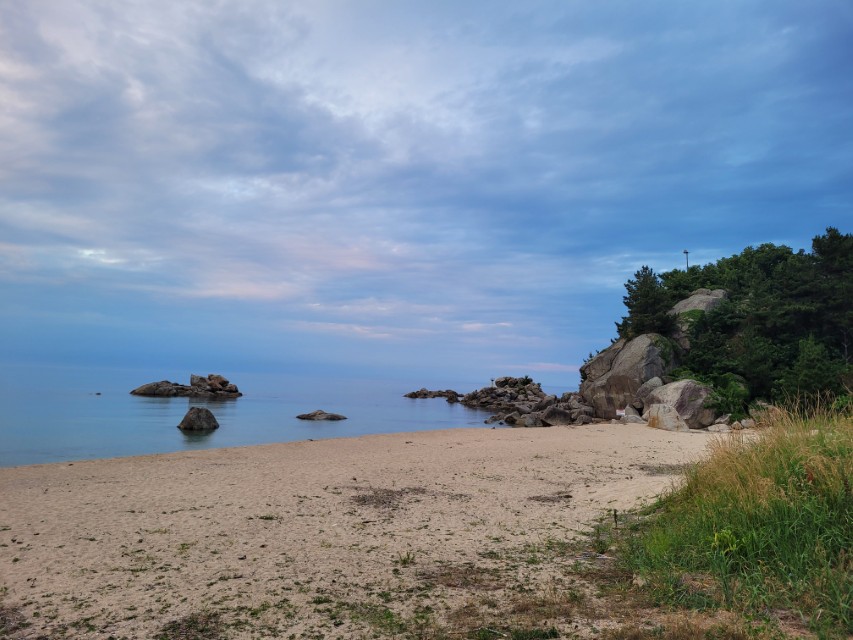 이날 가진해변은 하늘이 완전히 맑지는 않았지만 오히려 구름이 깔린 풍경 덕분에 더 차분한 분위기가 느껴졌습니다.