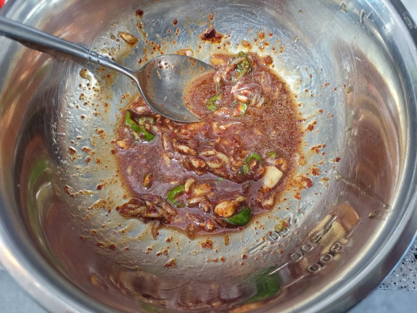 물, 새우젓, 간장, 고춧가루, 다진 마늘, 설탕(또는 올리고당)을 넣고 끓입니다. 처음에는 물을 적게 넣었더니 양념이 부족한 느낌이 있어서, 실제로는 종이컵 기준 반컵 정도 넣는 게 적당했습니다.